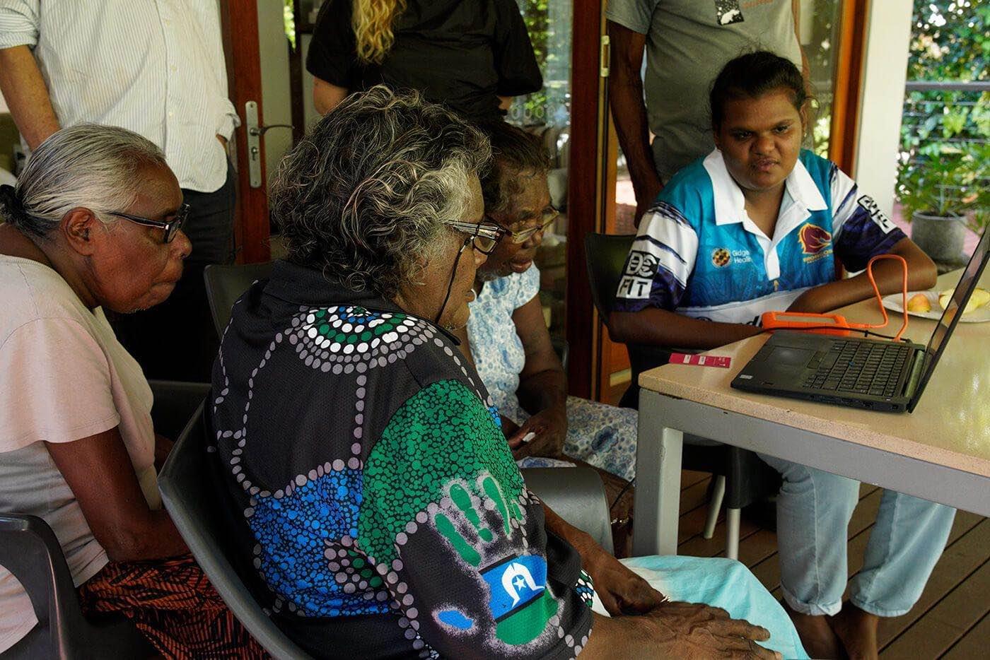 Juliette Lecorne, curator of the exhibition, presenting the digital project "Sally Gabori" layout to Tori Wilson, Elsie Gabori, Dorothy Gabori and Amanda Gabori. Cairns, 2022. Photo © Craig Bender and Vera Hong