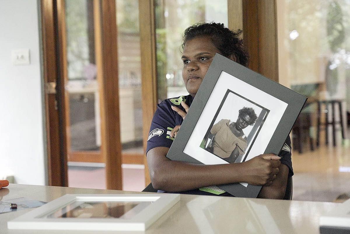 Tori Juwarnda Gabori holding a portrait of Sally Gabori, her great grandmother. Cairns, 2022. Video © Craig Bender and Vera Hong