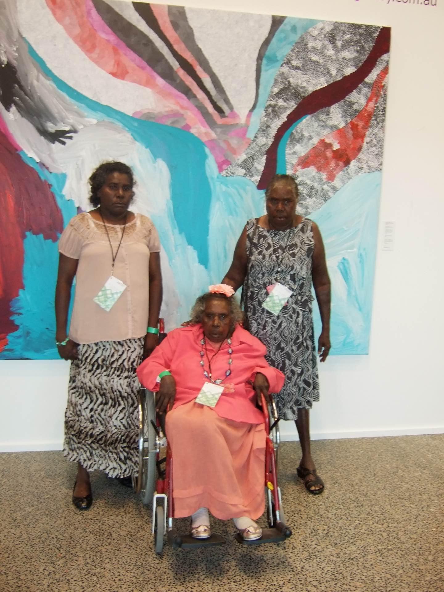 Sally Gabori, Amanda Gabori and Elsie Gabori, in front of their collaborative painting Pat & Sally's Country. Cairns Indigenous Art Fair, 2011. Photo © Alcaston Gallery, Melbourne © The Estate of Sally Gabori / Adagp, Paris, 2022